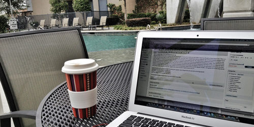 Today I’m working outside. It’s a beautiful 70 degrees, overcast, and I’m surrounded by rushing water. Plus I have Wifi!