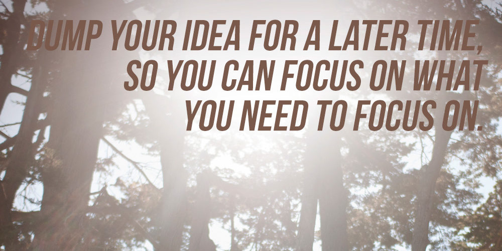 That’s the beauty of Moleskine notebooks, writing programs, Evernote… They let you dump your idea for a later time, so you can focus on what you need to focus on. And heck, set a reminded 2 months from now to pick it back up and dust it off. The timing might be right.